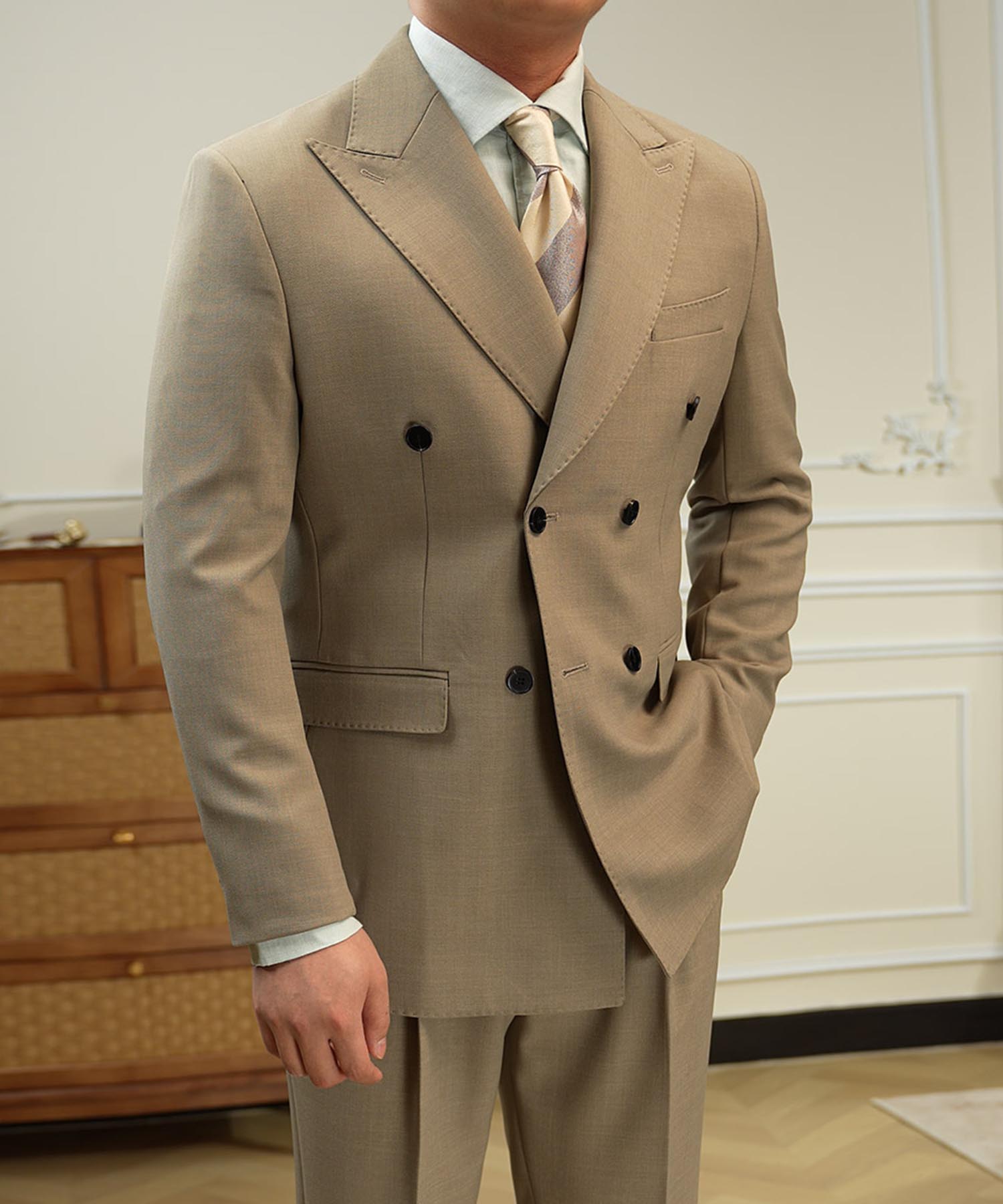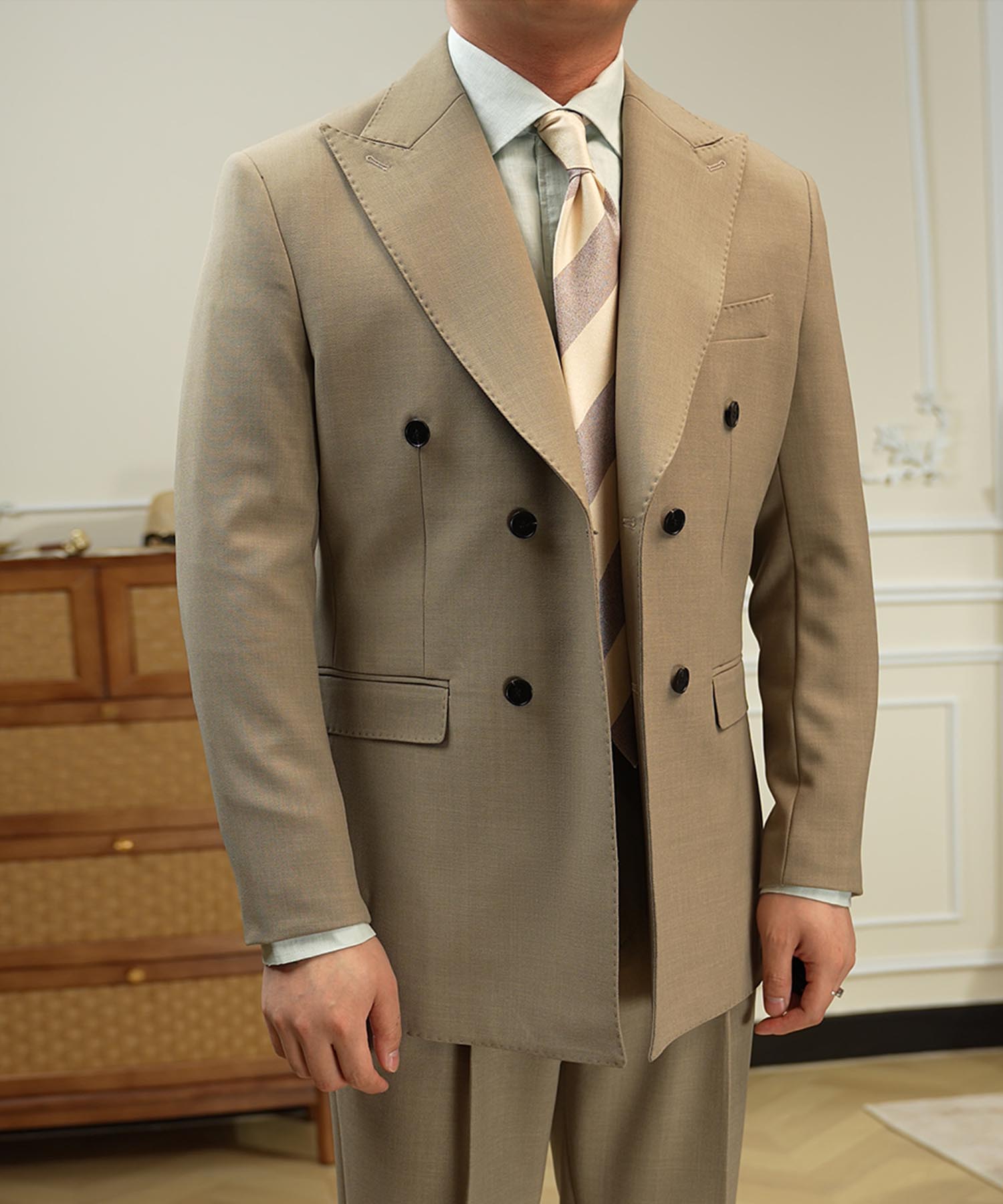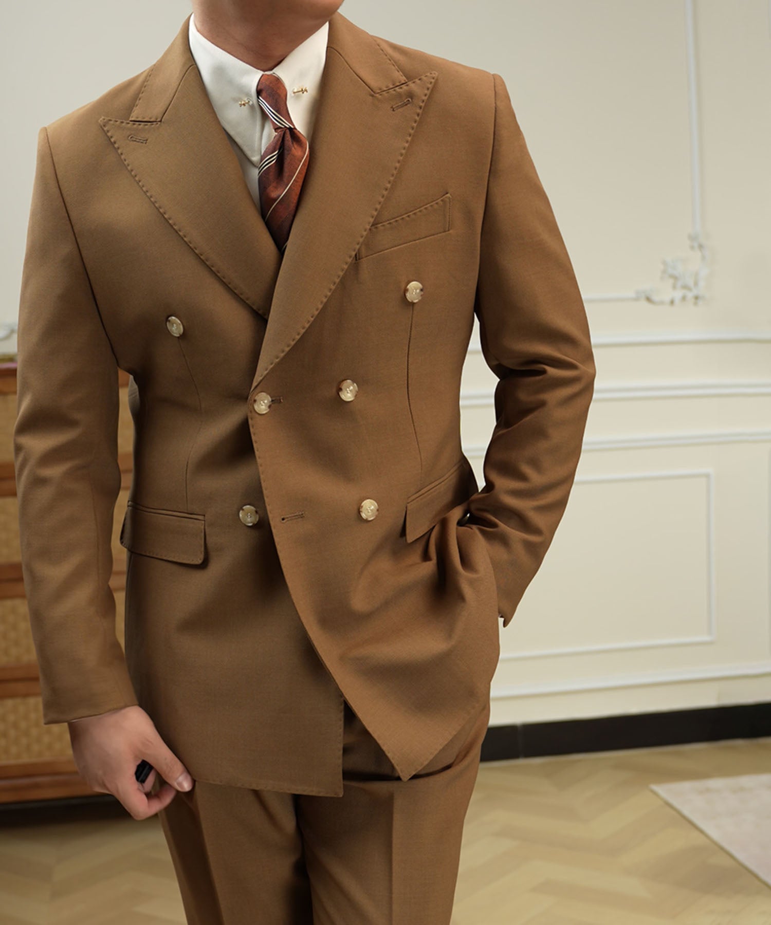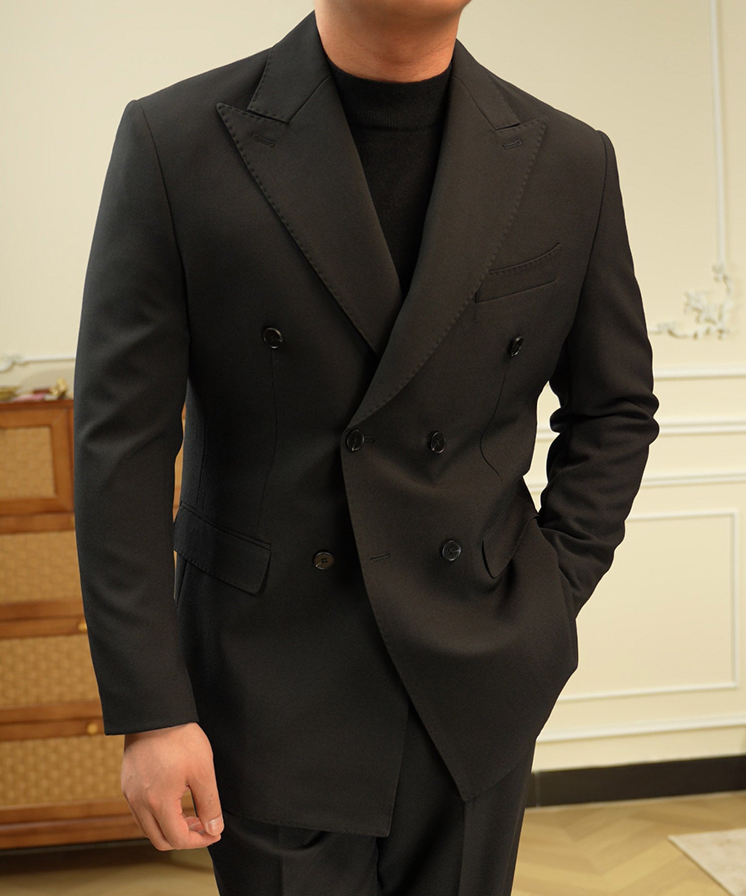 ・ピークドラペルと端正なシルエットが品格を引き立てる一着です。