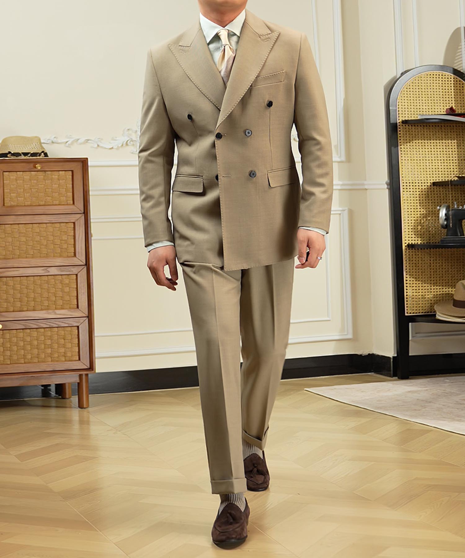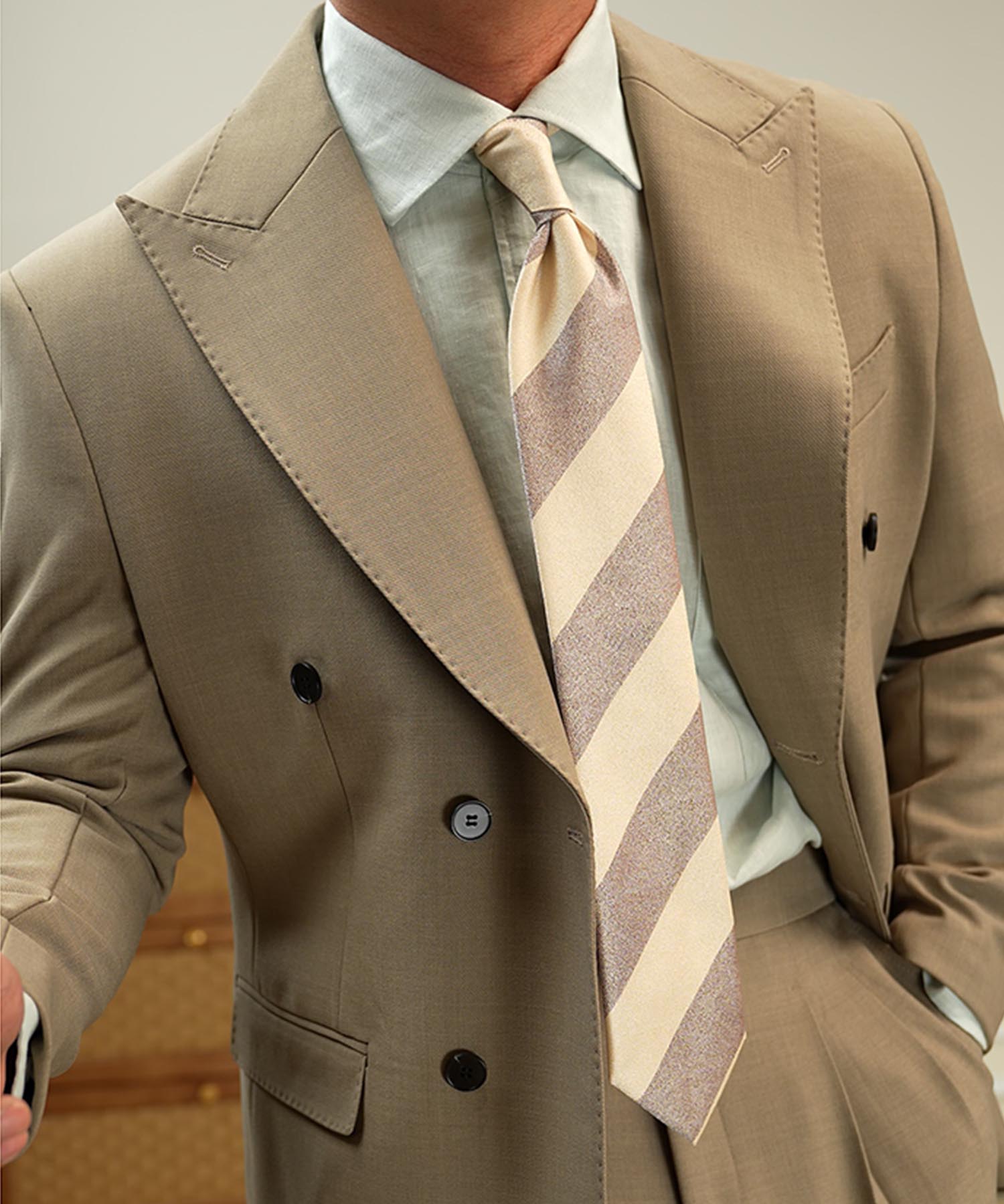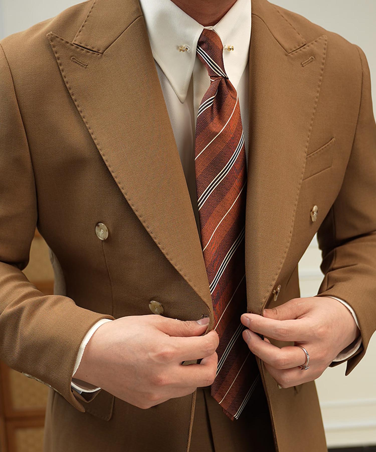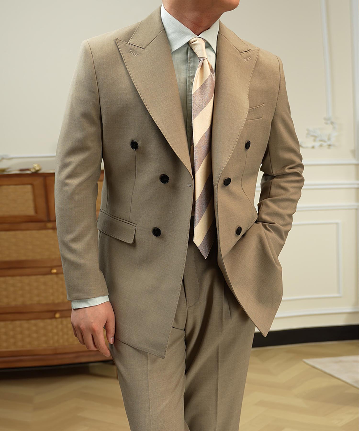 ・ピークドラペルと端正なシルエットが品格を引き立てる一着です。