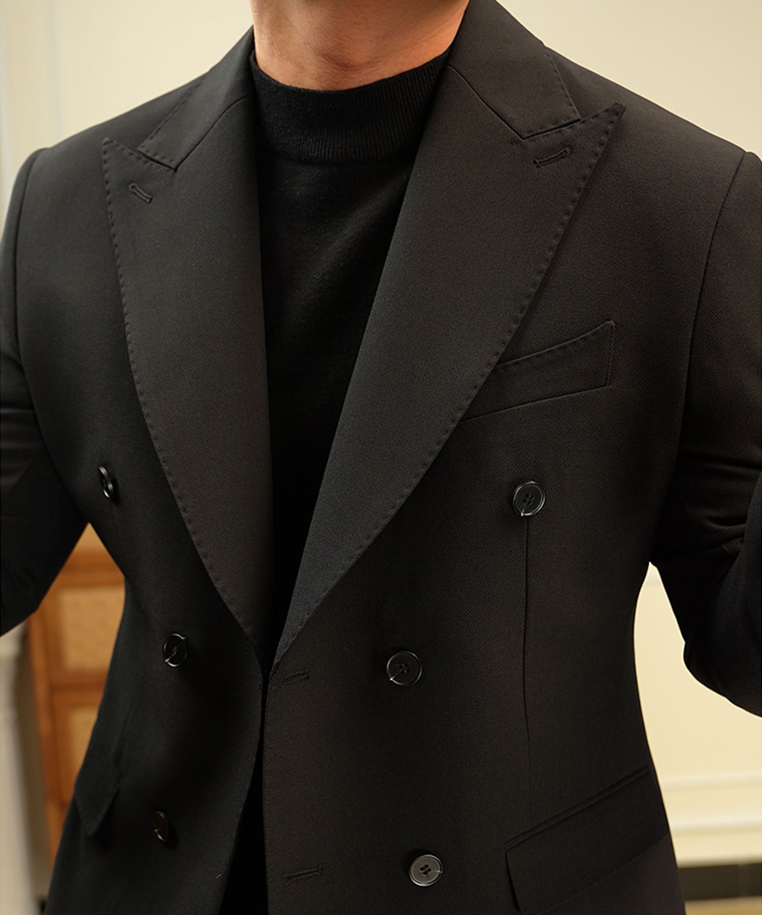 【NEW ITEM】スリムフィット ダブルブレスト 6つボタン 無地 フラップポケット 機能性抜群 シワになりにくい ピークドラペル モダン テーラード ジャケット